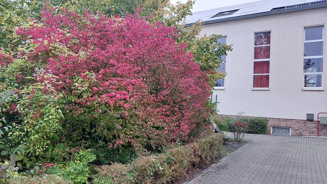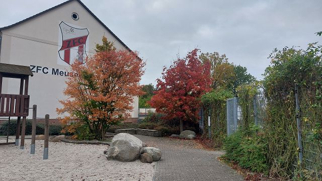 | Kupferfellenbirne links und Blutbuche rechts begrüßen jetzt die Fußballer auf dem Weg zu ihren Kabinen. |
